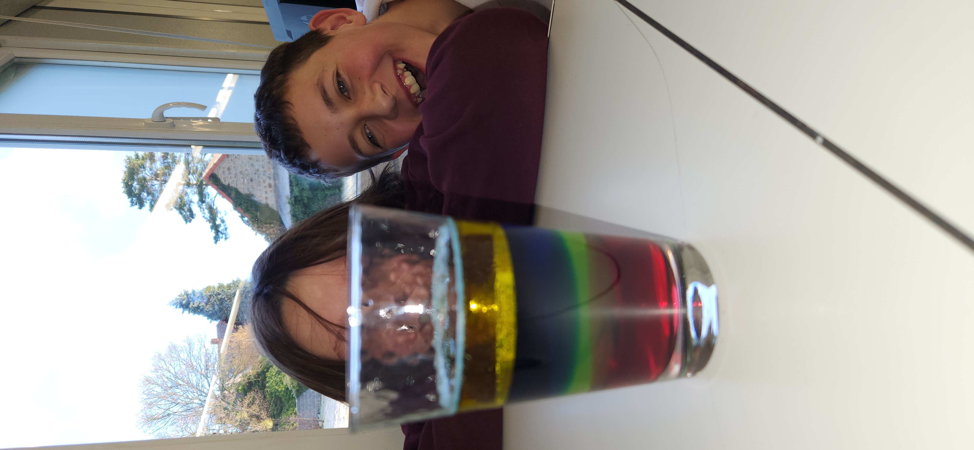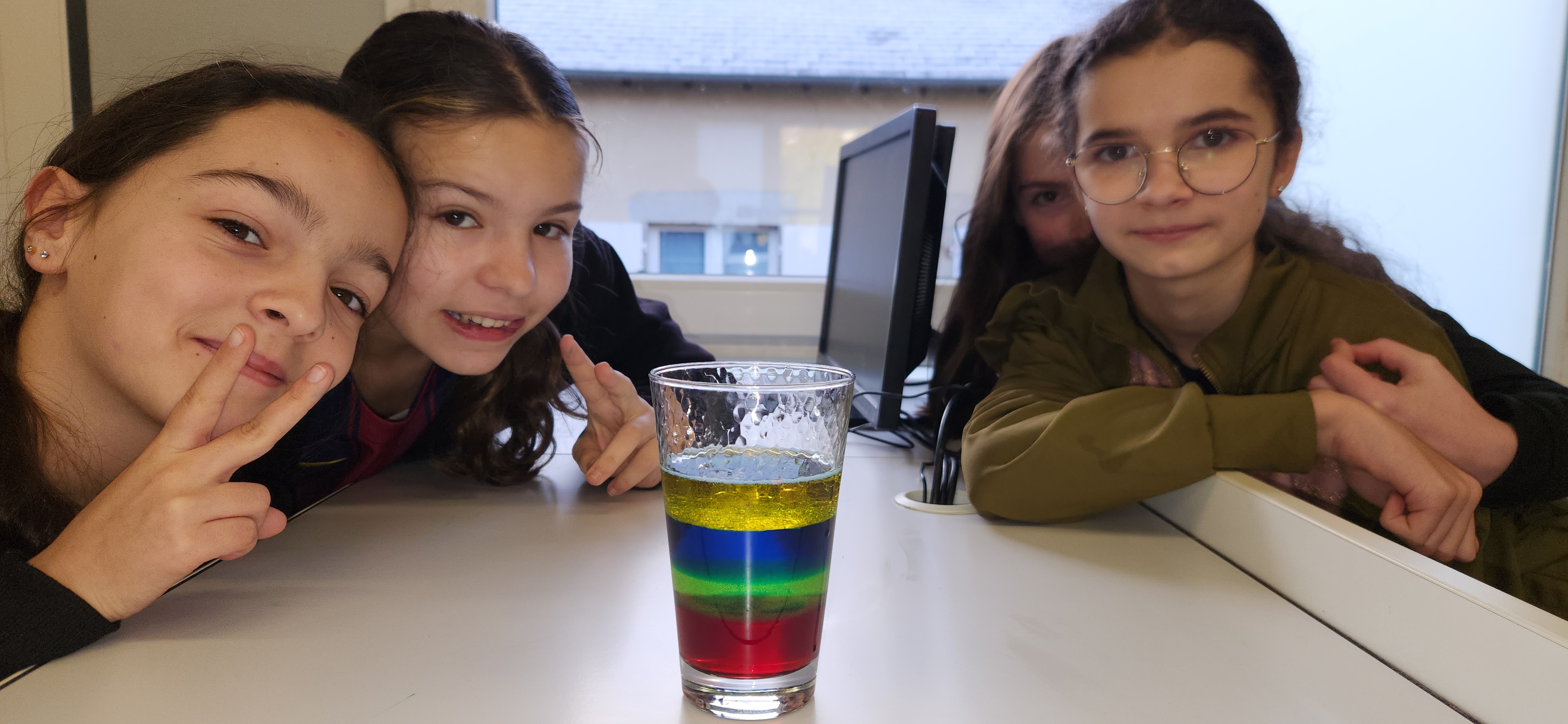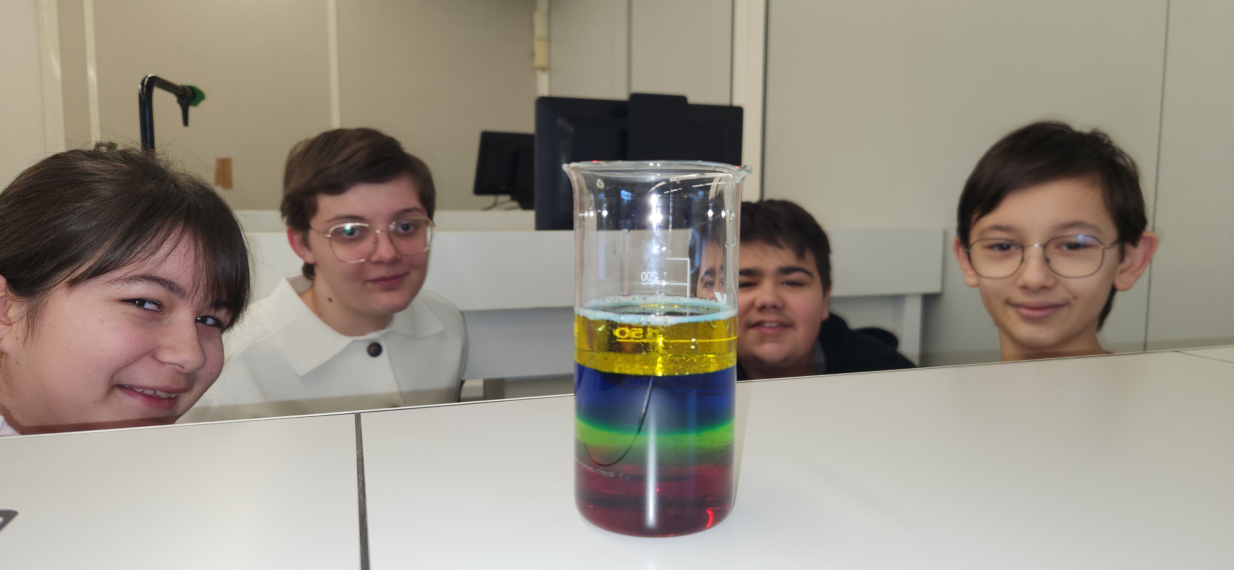 Au cours de cette séance, ils ont mis en pratique leurs connaissances sur les masses volumiques en réalisant des cocktails colorés à étages, puis ont découvert le principe des lampes à laves à travers une transformation chimique.