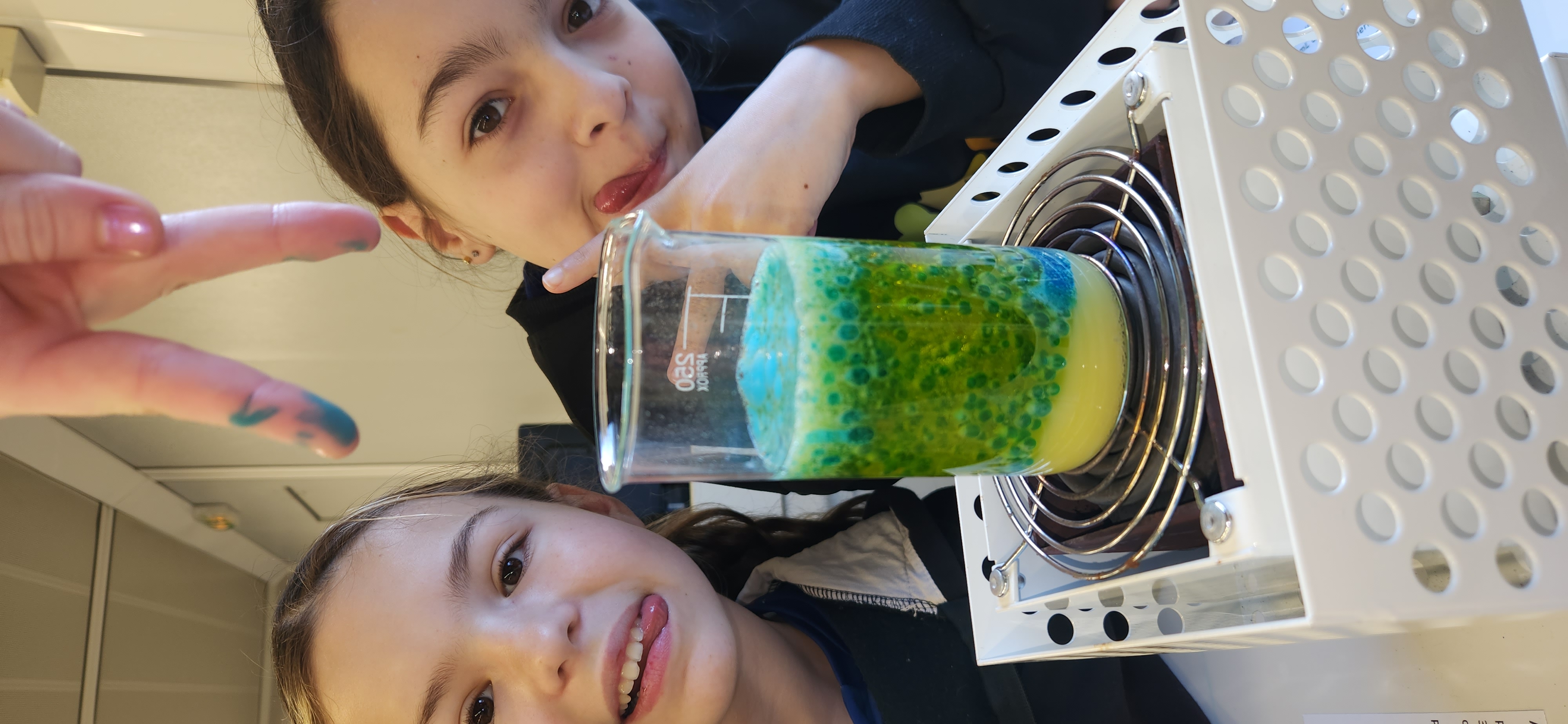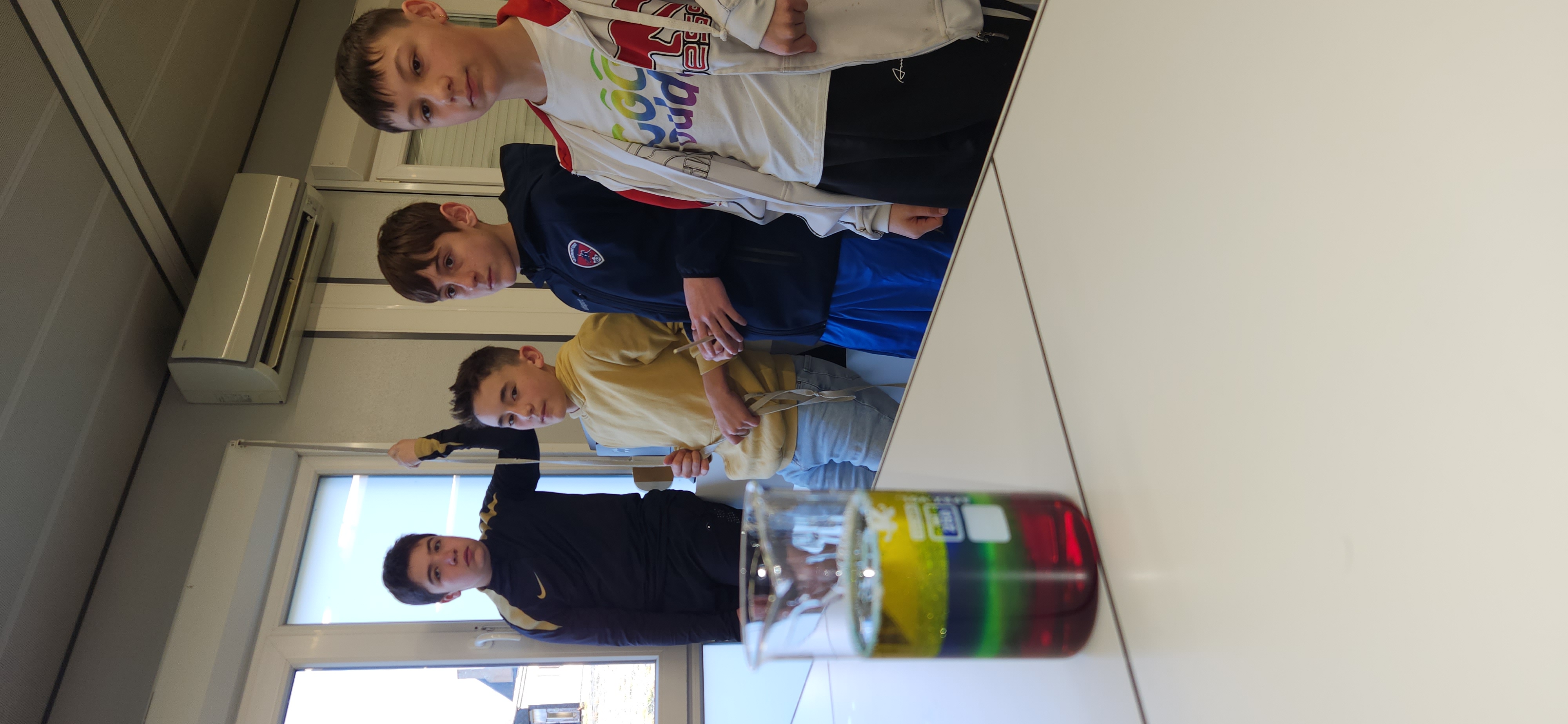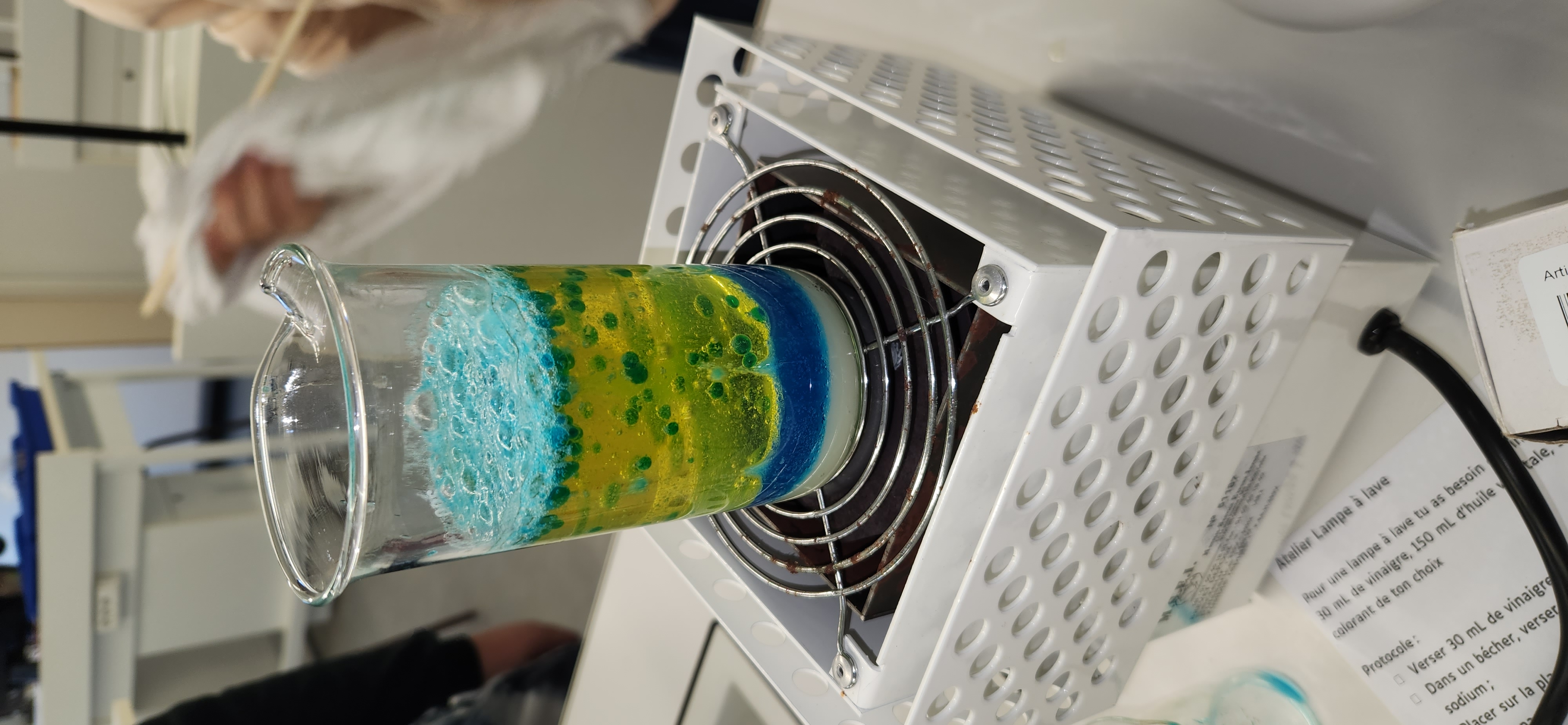 Au cours de cette séance, ils ont mis en pratique leurs connaissances sur les masses volumiques en réalisant des cocktails colorés à étages, puis ont découvert le principe des lampes à laves à travers une transformation chimique.